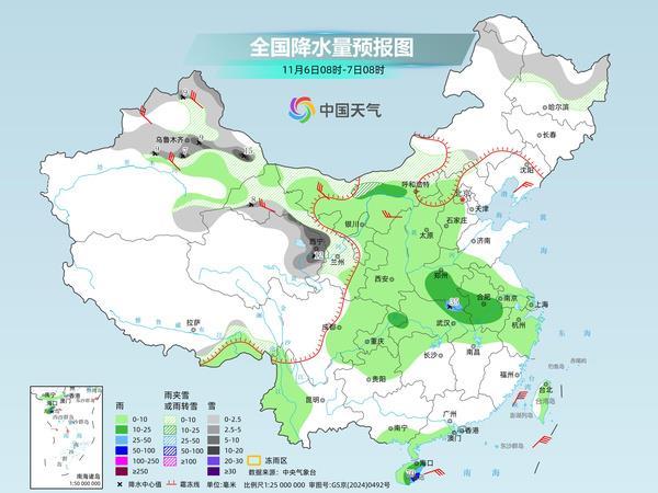 明天,新疆北部和东部、青海东部、甘肃中西部、内蒙古中西部和东北部、黑龙江中北部、河北西北部等地部分地区有小到中雪或雨夹雪,其中,新疆沿天山地区、青海东北部、甘肃河西等地部分地区有大到暴雪,新增积雪2~8厘米,局地10厘米以上。内蒙古河套地区、河南中南部、湖北东北部、安徽中部、重庆东北部、海南岛中东部等地部分地区有中到大雨,其中,海南岛东南部局地有暴雨。
